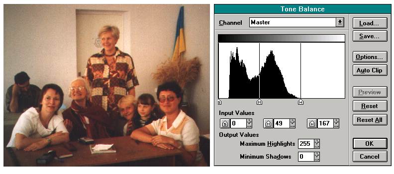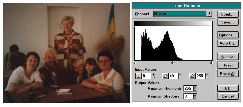 This illustration shows how the photograph looked just after scanning. Selecting "Tone balance" option in the "Map" menu of the Picture Publisher, you shall see the histogram. It shows the shades which the image really occupies between two extreme limits � black and white. In the photograph the sheet of paper lying on the table should be obviously white, but it isn't so. Drag by the mouse the right boundary to the left, setting it near the right side of the black area of histogram. It will make brightest areas of the image really bright. Of course, it should be done discriminately, for the image may not contain bright areas. Similarly you may drag the left boundary right, to make darkest areas really black, if necessary. This operation works more accurate and is more convenient than mere brightness and contrast adjustment. The result is shown below.